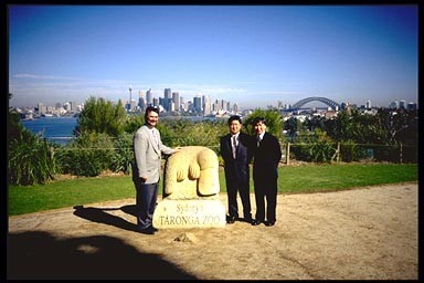ドクターギレスさんの歓迎を受け、簡単なミーティングの後、園内を案内していただく。真っ先に、東京の都市博で公開が予定されていた「かものはし」(プラツトパス)の飼育場を見せていただく。雄と雌の2頭が飼われ8月の交配の時期を楽しみにされていた。子供は双子で生まれ1頭は育たないといわれている。卵で生まれ、乳で育つ2種類しかいない哺乳動物で100万年を超える年月に生きてきたとの説明を受けた。 ニューサウスウェールズ州は東京都と姉妹関係にあり、シドニーは名古屋市と姉妹都市である。ちなみに大阪市はメルボルンと姉妹都市の関係を結んでいる。オーストラリアと日本は強い絆で結ばれており、日本にとって数少ない貿易赤字国の1つでもある。交戦国日本に対する感情を残しながらも、戦後50年で世代が変わり日本への意識も改善されてきている。昨日の「ハンクさん」といい動物園の「エドさん」といい、本当に親切にしていただき、感謝してもしきれない思いを残し、タロンガ動物園を後にする。